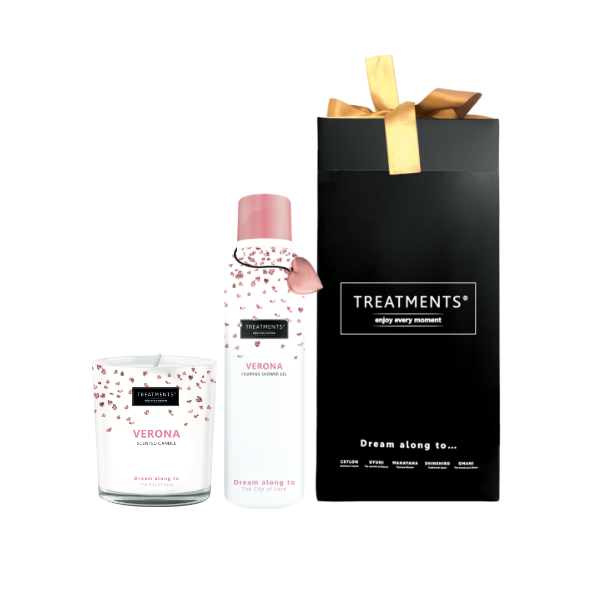 Voeg een vleugje foamige weldaad toe aan uw dagelijkse douchemoment met onze prachtige Giftbox! Trakteer uzelf, of verras een dierbare met deze stijlvolle set, die bestaat uit een heerlijk verfrissende Foaming Shower Gel en een sfeervolle Scented Candle. Steek het kaarsje ruim voor het douchen aan, zodat uw badkamer zich langzaam vult met de betoverende geuren van Treatments®. Laat u meeslepen op een droomreis naar het schitterende Verona, terwijl de aroma’s uw zintuigen prikkelen.